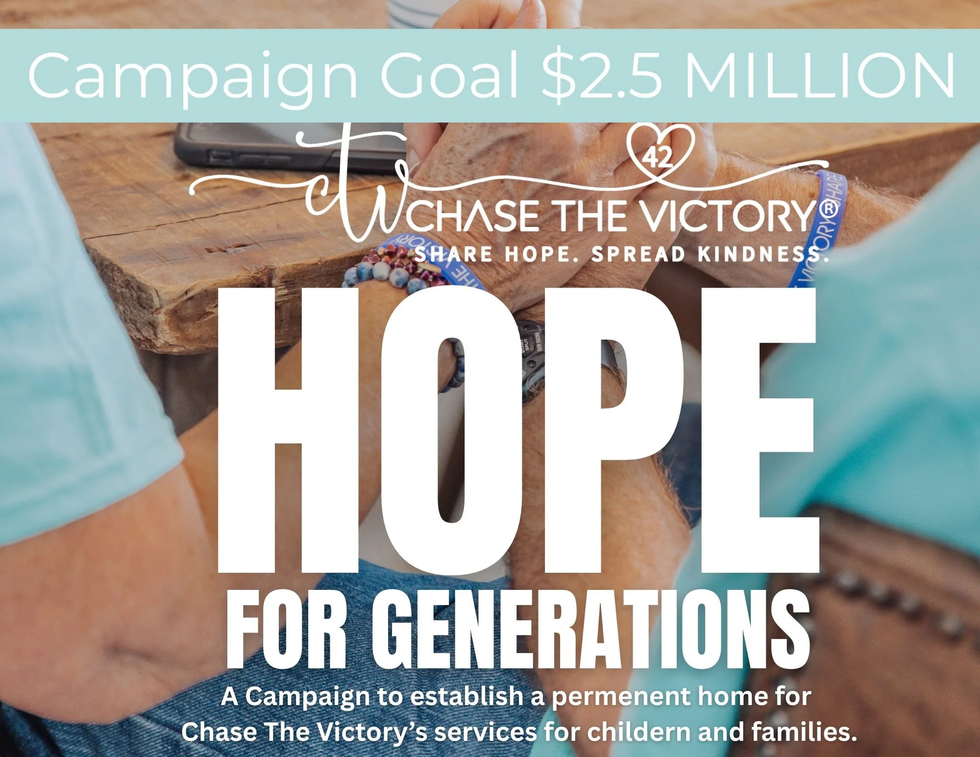 The goal of the Hope For Generations Capital Campaign is to raise $2.5 million to establish a permanent, headquarters for Chase The Victory, located in Carrollton, Georgia. It will serve as a centralized hub for all of our bereavement, pediatric oncology, and legacy programming. More than just a building, it will be a safe haven for broken hearts, a sanctuary of healing where children and families can gather, receive comfort, and find community and compassion.